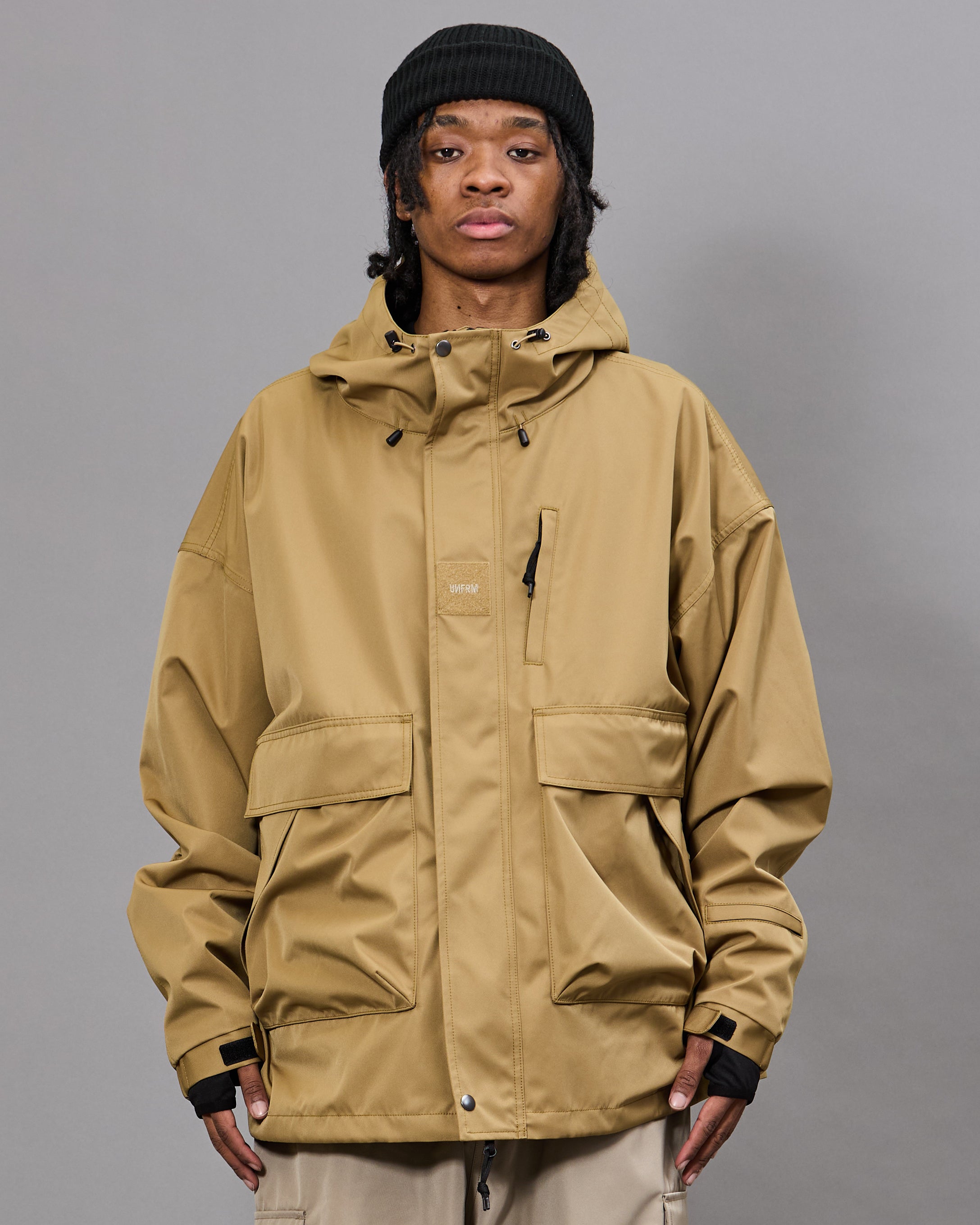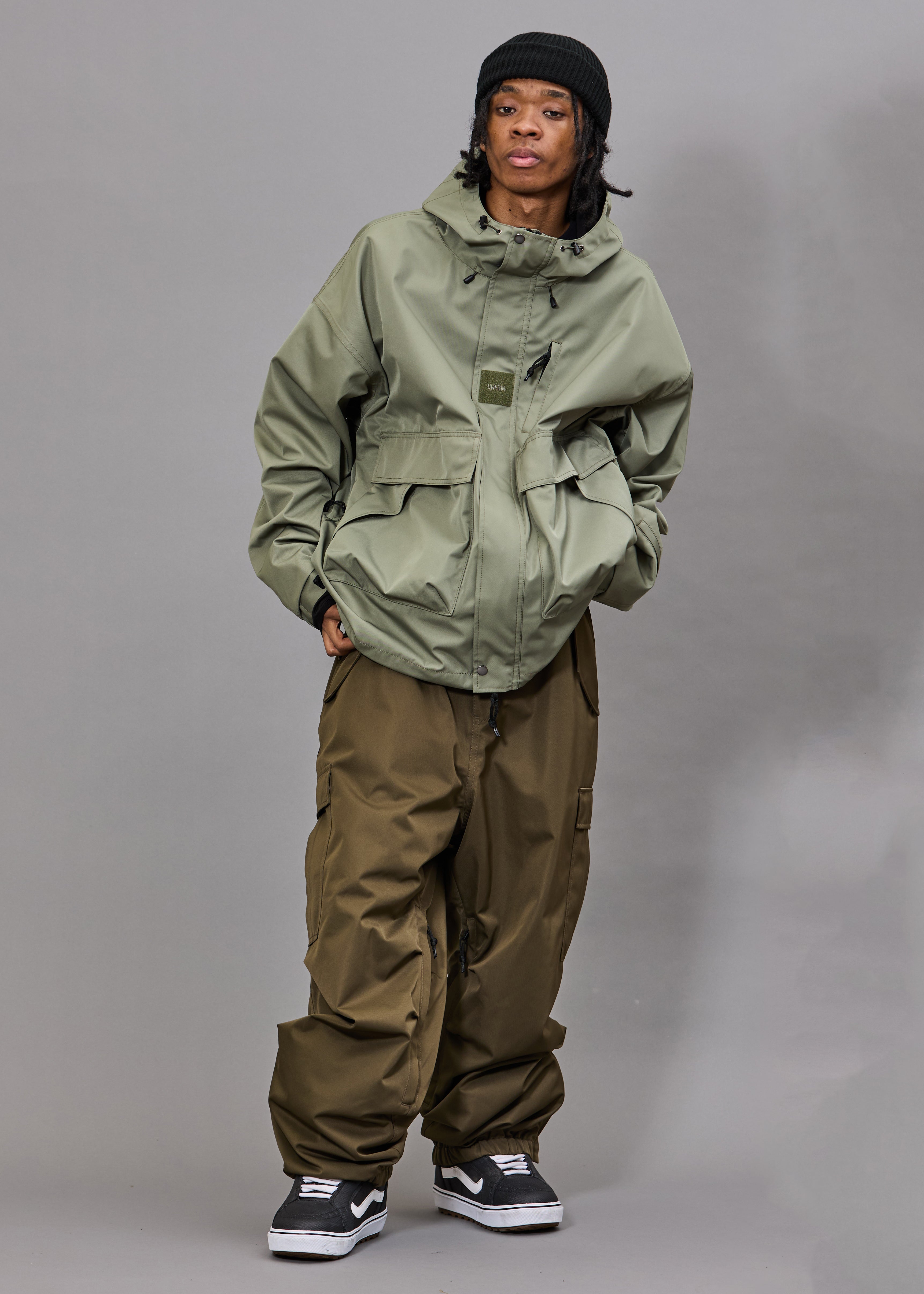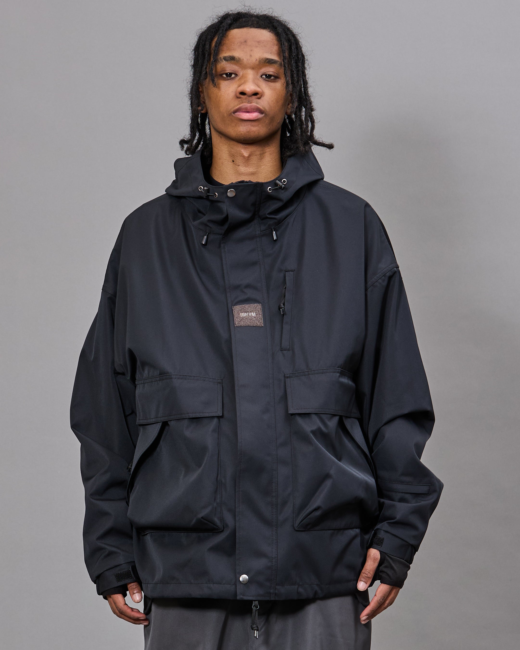 マウンテンパーカーにミリタリーディテールを融合させた、UNFRMらしいデザインが特長のブランドを代表するアイテム。ゆったりとした腕周り、大きく取った肩幅と身幅によるワイドシルエットが、機能性と存在感を両立します。フロント・サイド・インナーポケットを含む計8つのポケットを配置し、収納力とデザイン性を兼備。さらに2箇所のベンチレーションを備え、アクティブな環境下でも快適な着心地をキープします。パンツと連結できるパウダーガードや、脱着式のリストゲーター・ウエストゲーターを搭載し、雪山から街まで対応する2WAY仕様。裾には2箇所のドローコードを設け、シルエットの調整が可能です。表面には撥水加工を施し、生地本体は 耐水圧10,000mm/透湿性20,000g/m²/24h を実現。UNFRMの機能性とデザイン哲学を象徴する、ハイスペックなジャケットです。
