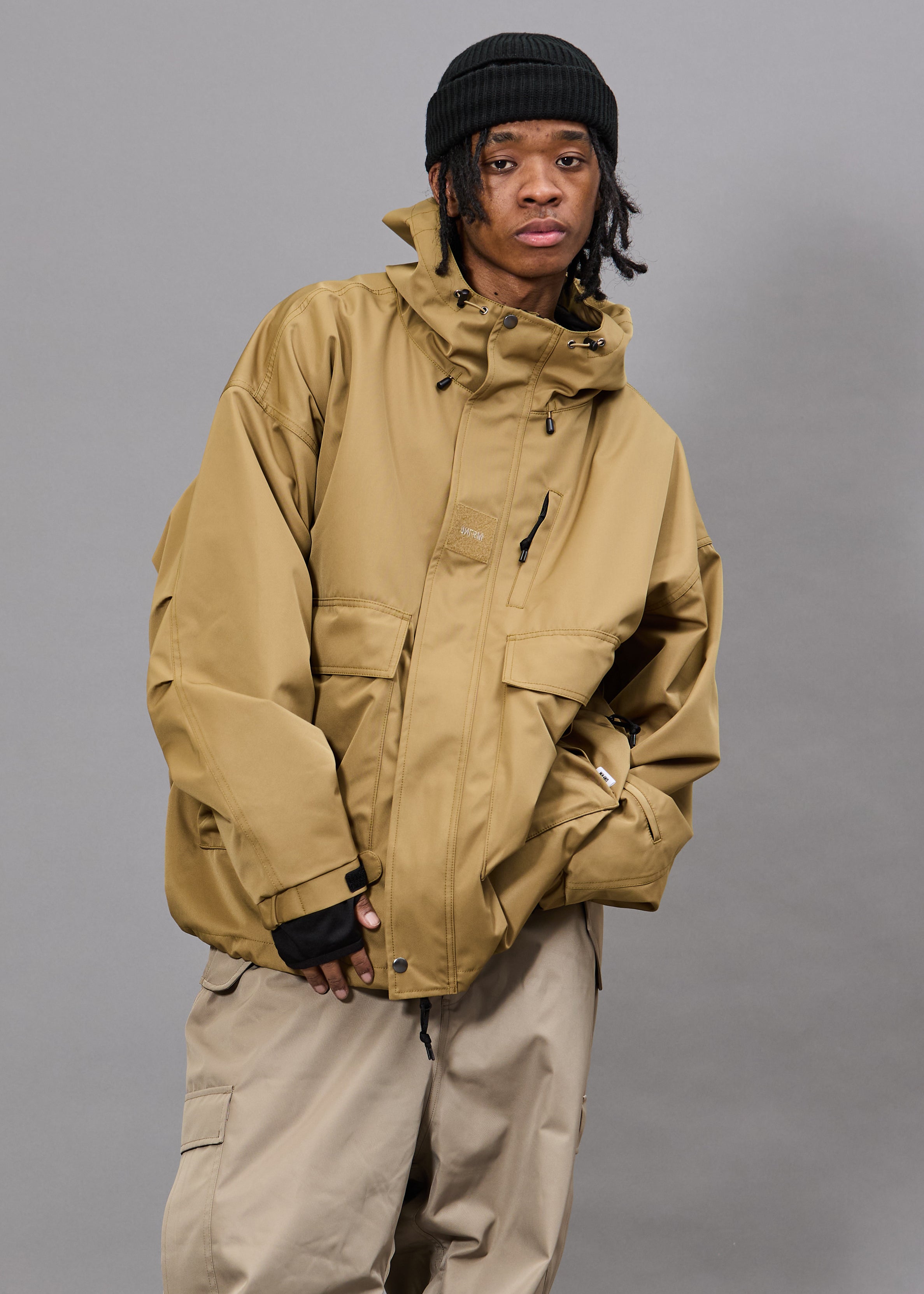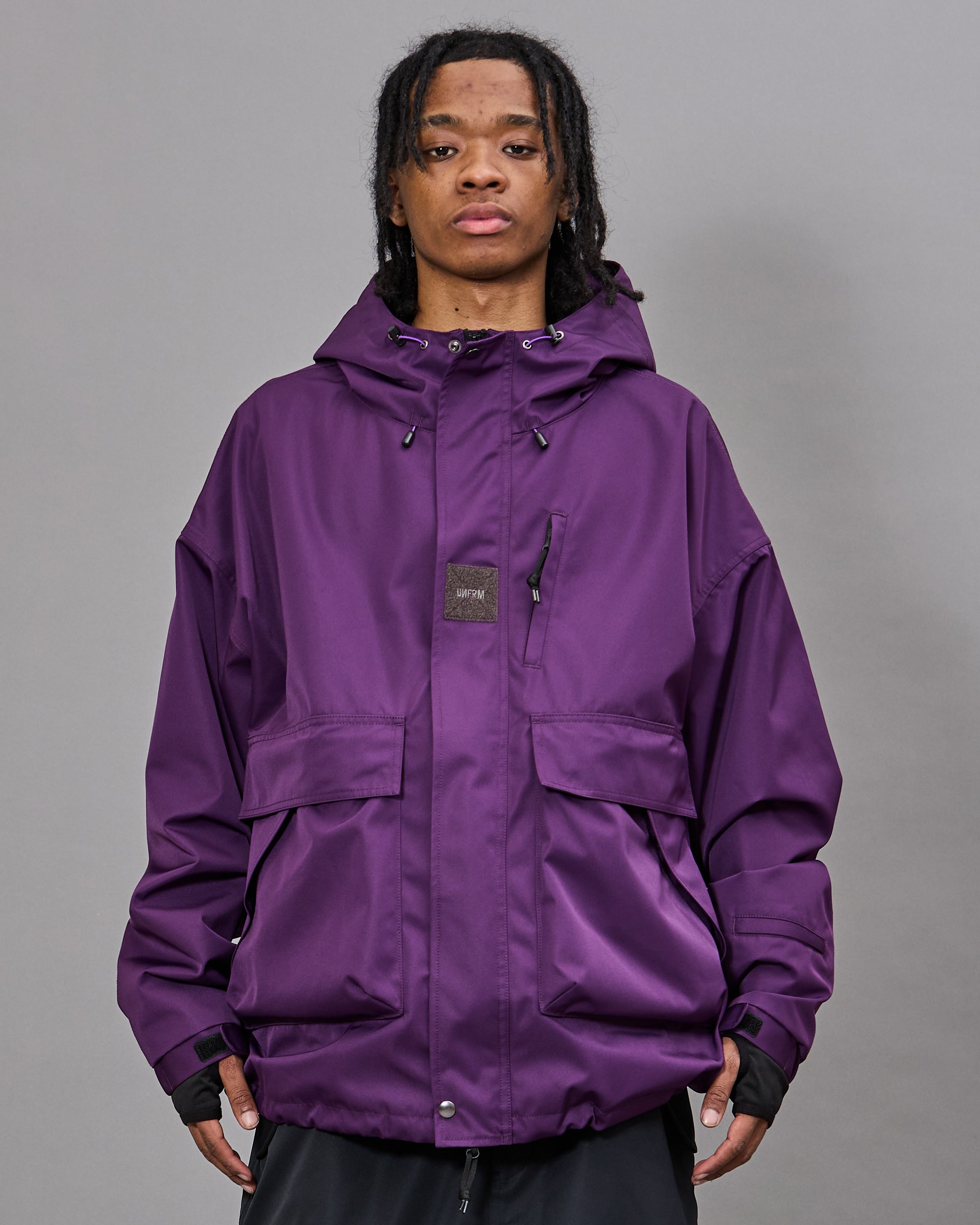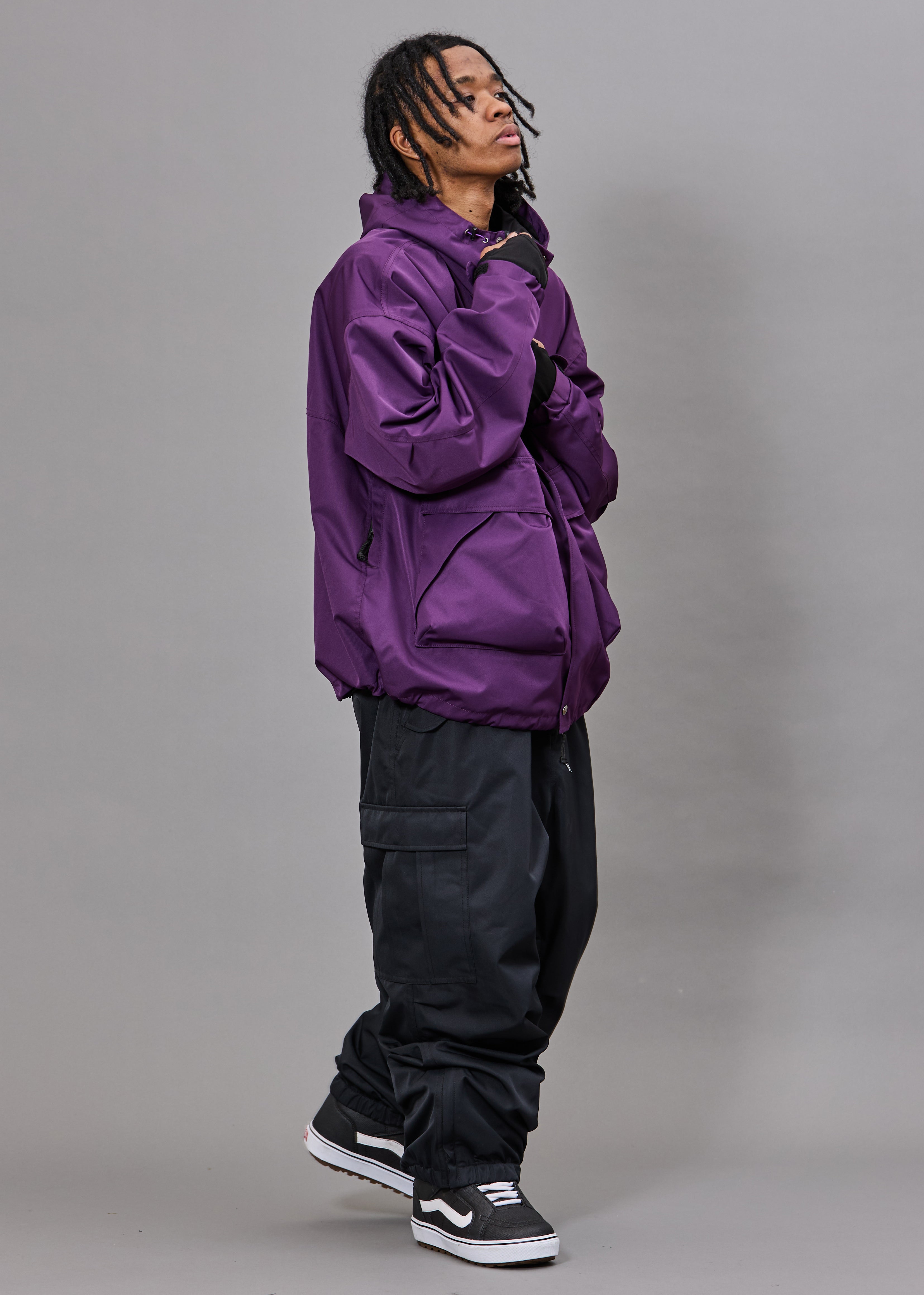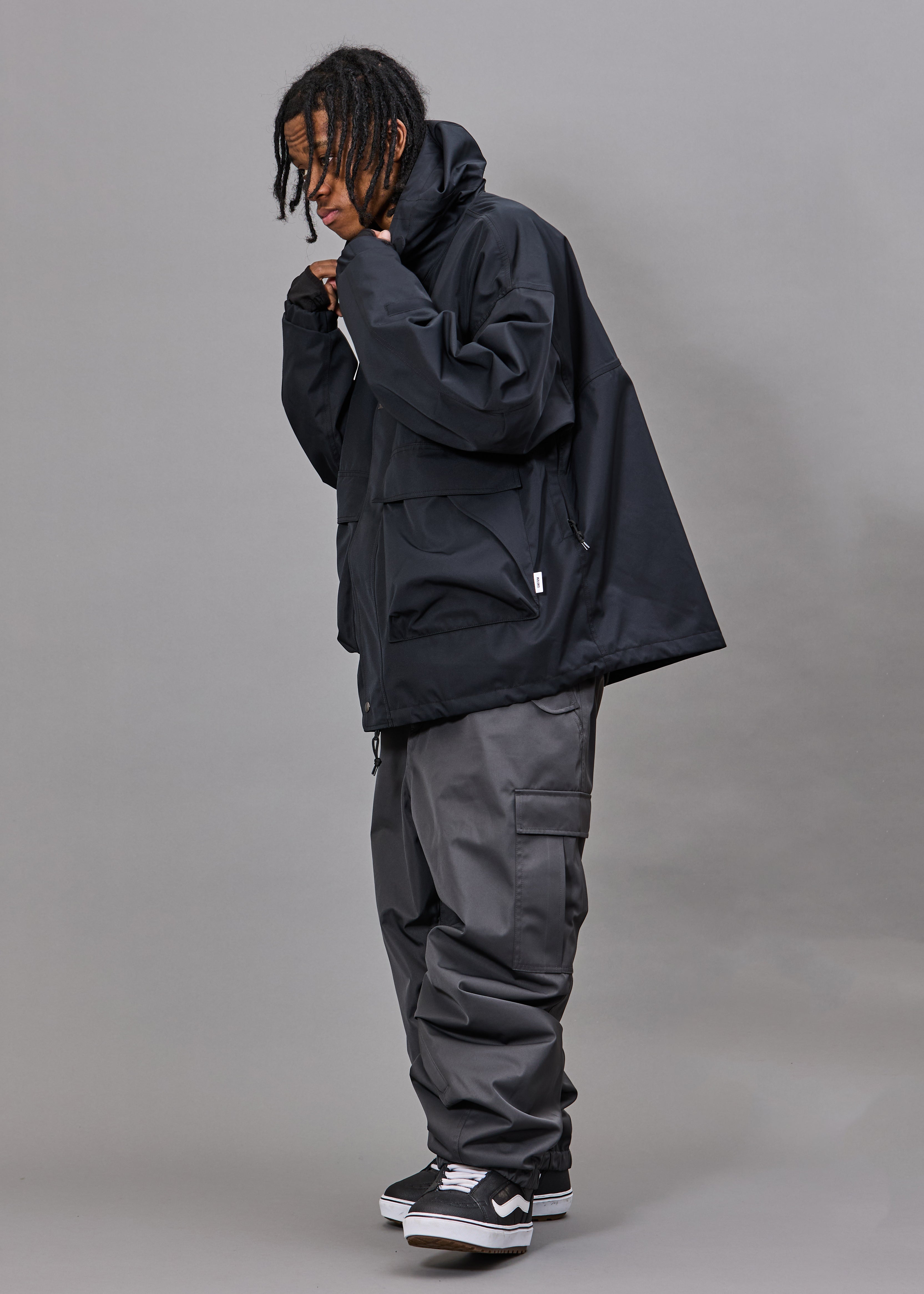 マウンテンパーカーにミリタリーディテールを融合させた、UNFRMらしいデザインが特長のブランドを代表するアイテム。ゆったりとした腕周り、大きく取った肩幅と身幅によるワイドシルエットが、機能性と存在感を両立します。フロント・サイド・インナーポケットを含む計8つのポケットを配置し、収納力とデザイン性を兼備。さらに2箇所のベンチレーションを備え、アクティブな環境下でも快適な着心地をキープします。パンツと連結できるパウダーガードや、脱着式のリストゲーター・ウエストゲーターを搭載し、雪山から街まで対応する2WAY仕様。裾には2箇所のドローコードを設け、シルエットの調整が可能です。表面には撥水加工を施し、生地本体は 耐水圧10,000mm/透湿性20,000g/m²/24h を実現。UNFRMの機能性とデザイン哲学を象徴する、ハイスペックなジャケットです。