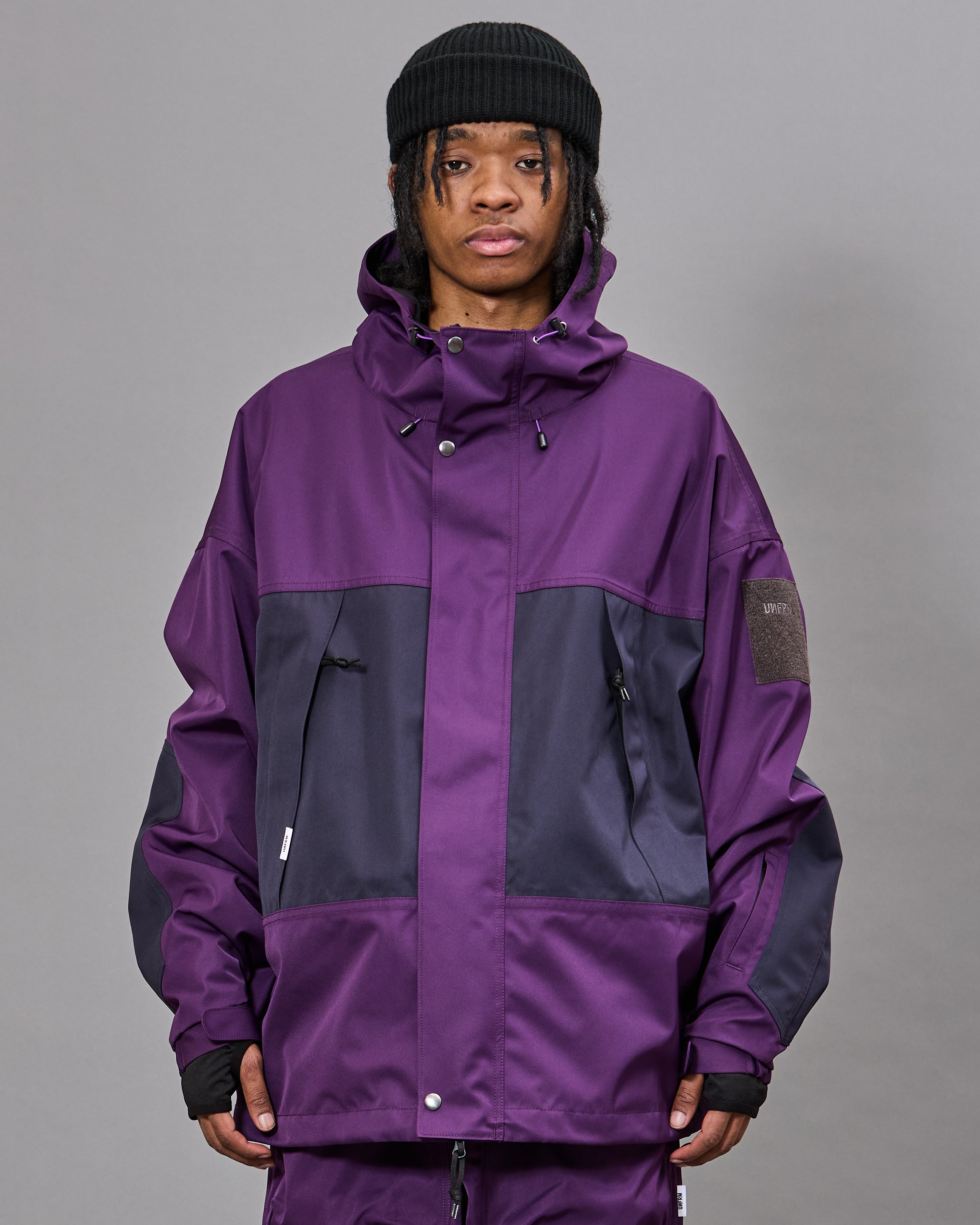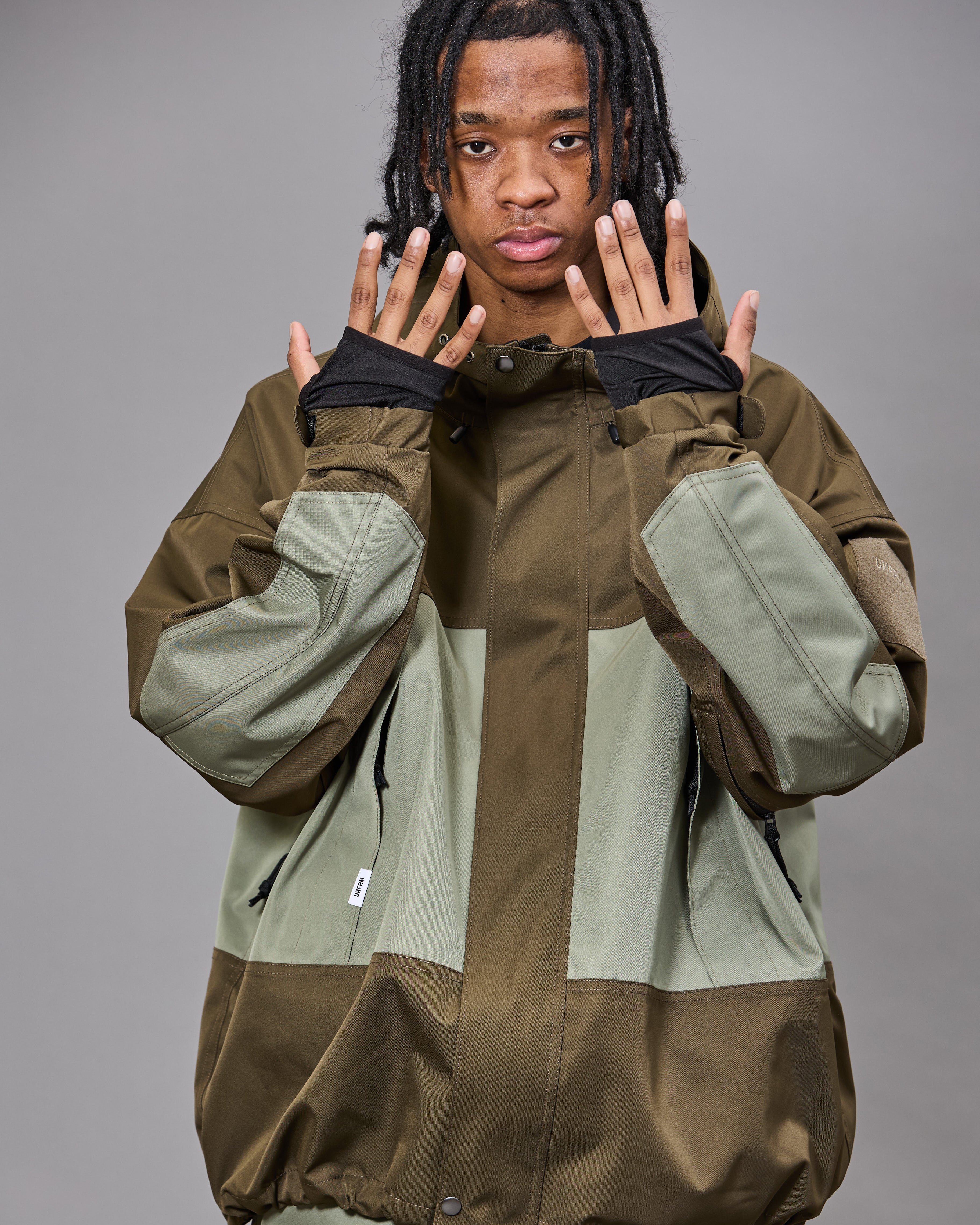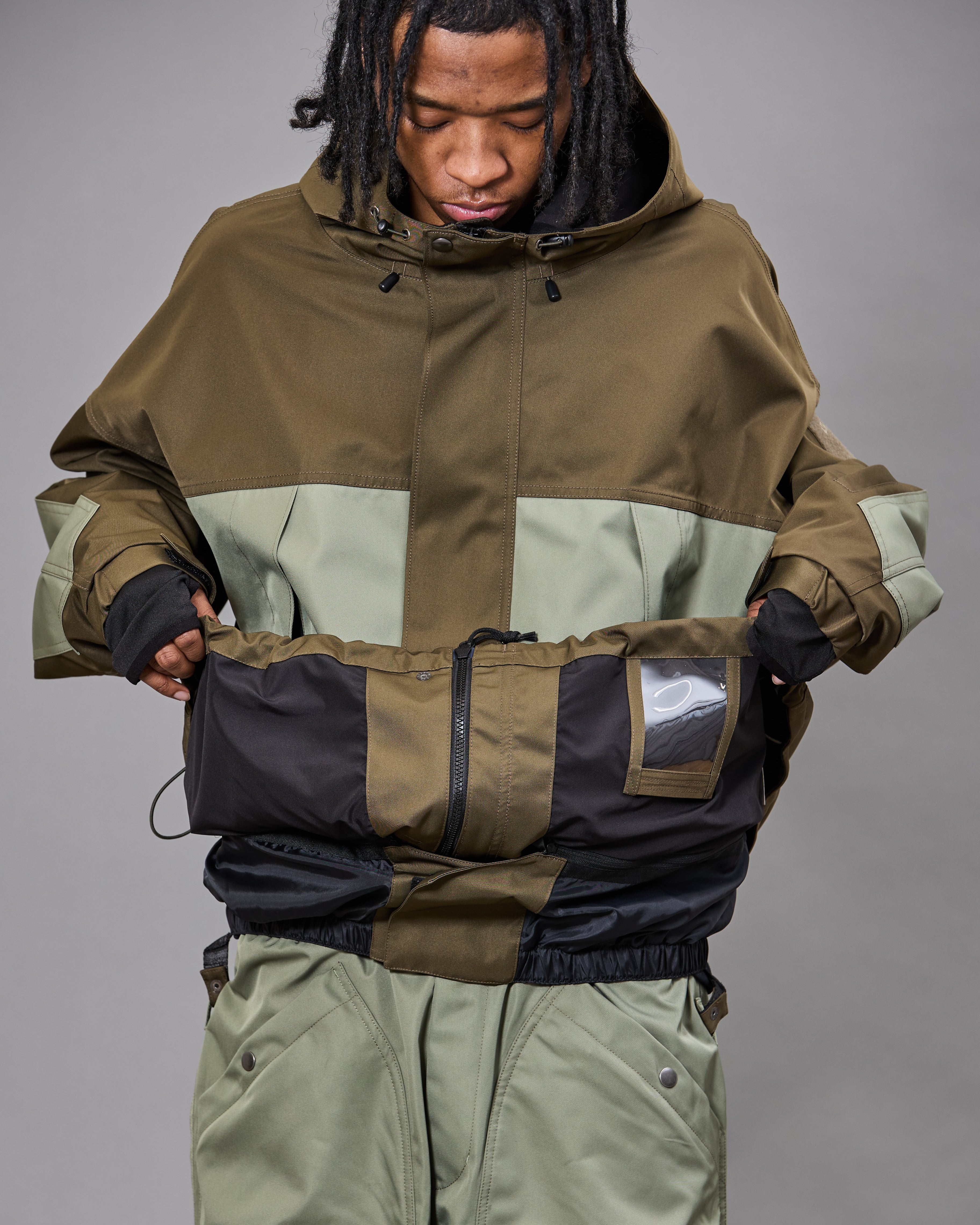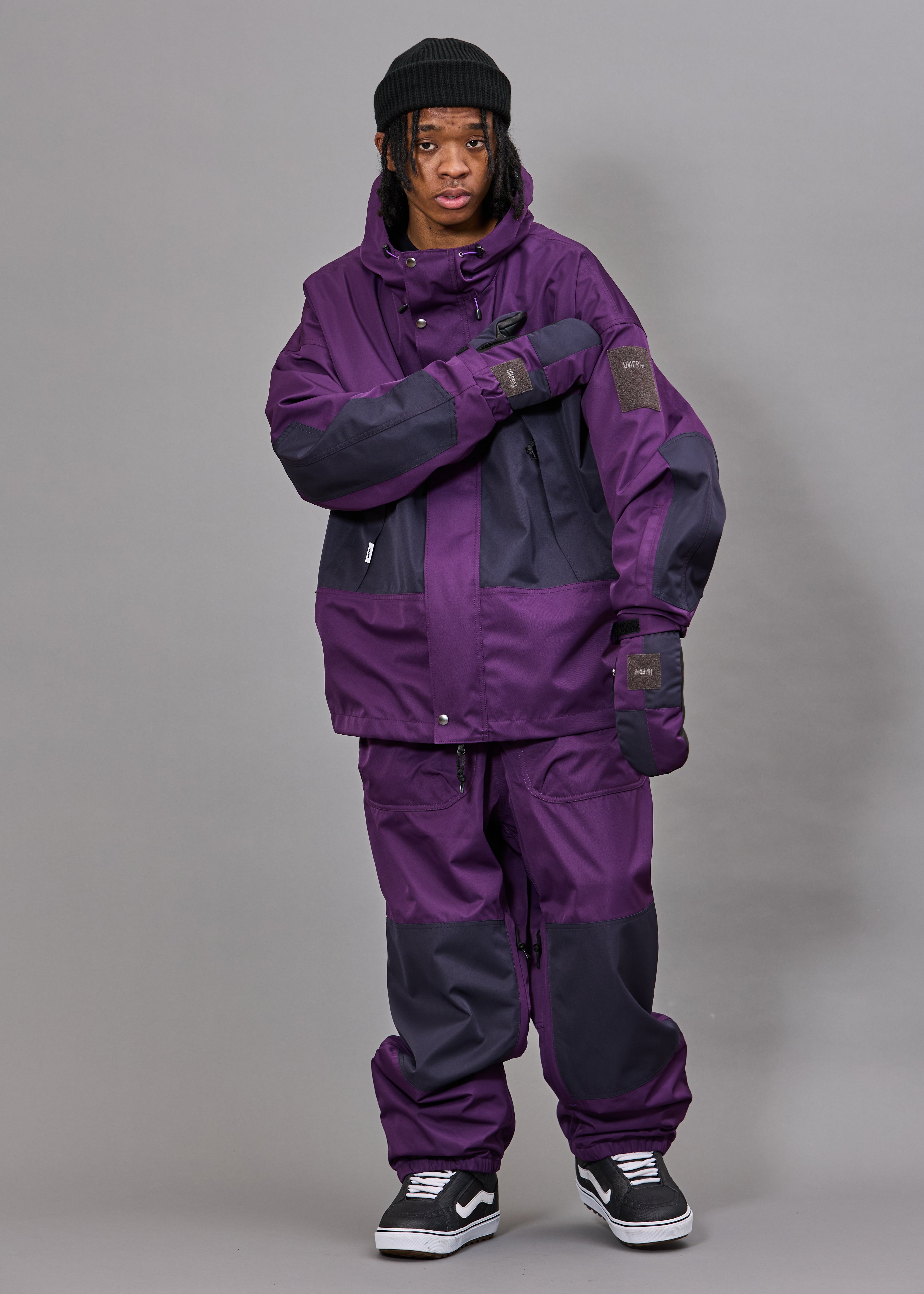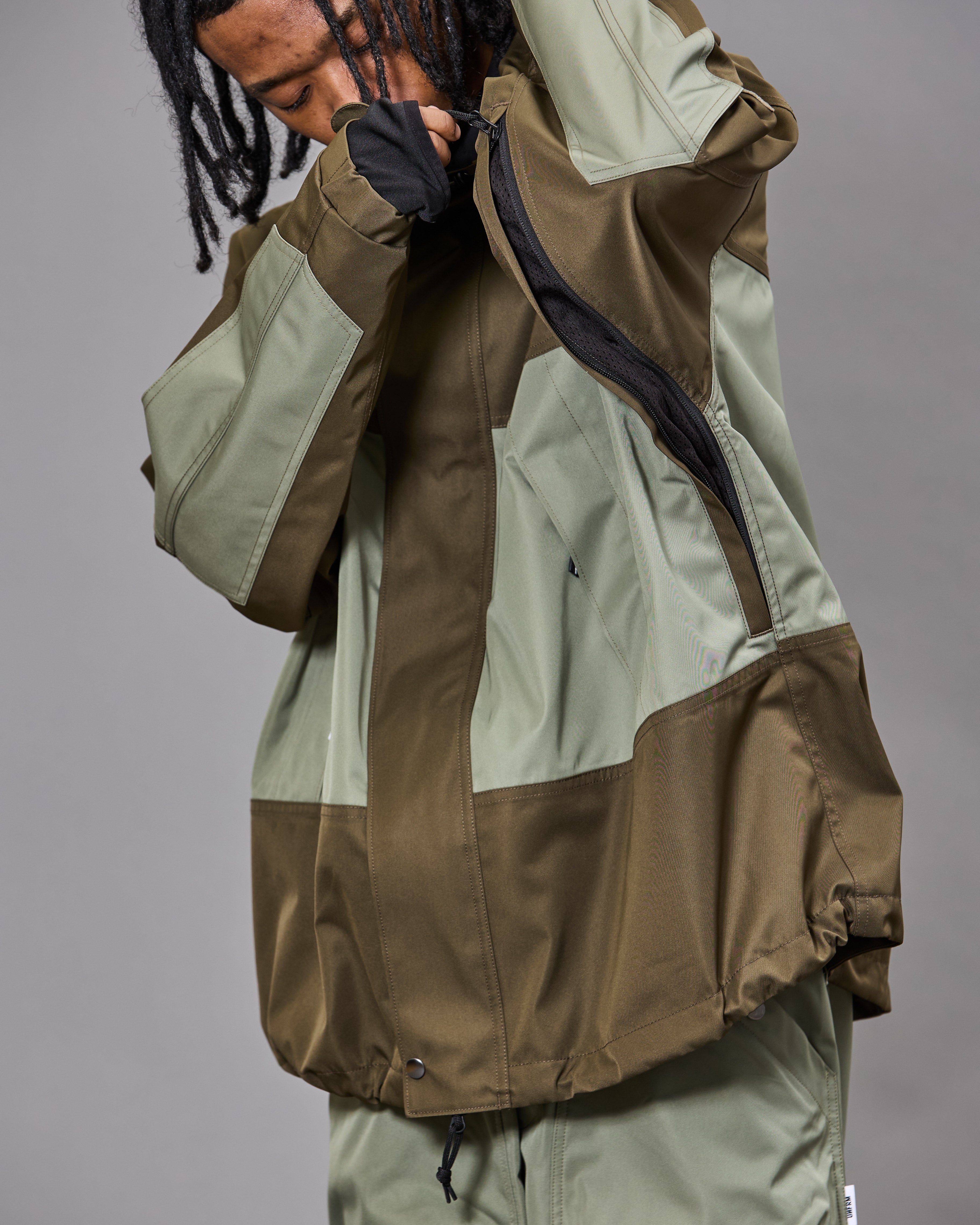 ミリタリーパーカーを着想源に、UNFRMらしいデザインと機能性を融合させた新作ジャケット。ミリタリー感だけでなく、雪山を連想させるディテールとワイドシルエットが特長です。UNFRMの中でも丈が長く、あらゆる環境下でも快適に着用できる設計 で、都市からフィールドまで幅広く対応。フロントの大きなジップポケットを含む5つのポケットと、2箇所のベンチレーションを装備し、機能性と利便性を両立しました。裾には2箇所のドローコードを配置し、シルエット調整が可能。パンツと連結できるパウダーガードに加え、リストゲーター・ウエストゲーターは脱着式で、雪山から街まで対応する2WAY仕様となっています。表面には撥水加工を施し、生地本体は 耐水圧10,000mm/透湿性20,000g/m²/24h を実現。高い機能性と洗練されたデザインを兼ね備えた、UNFRMを象徴するハイスペックジャケットです。