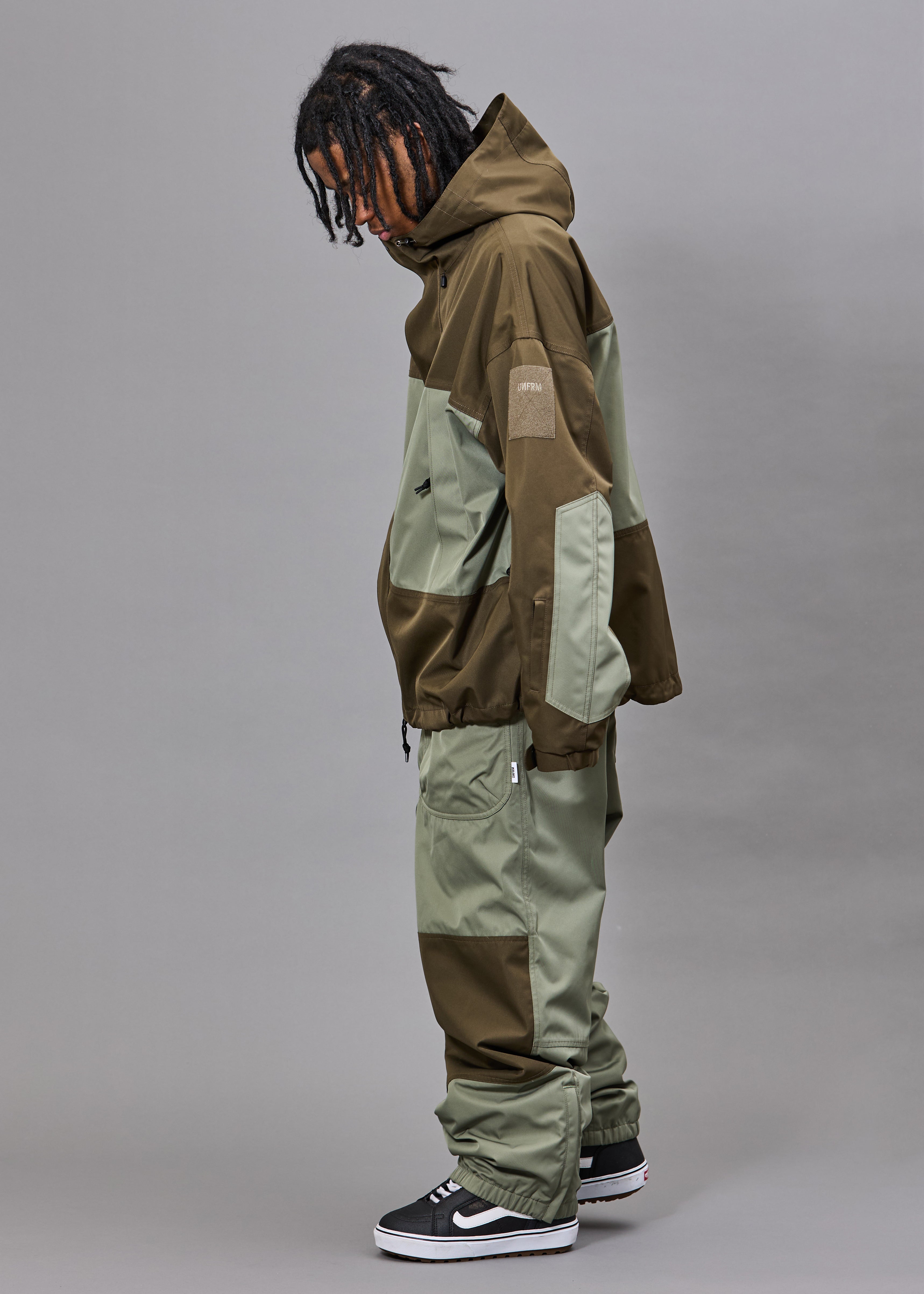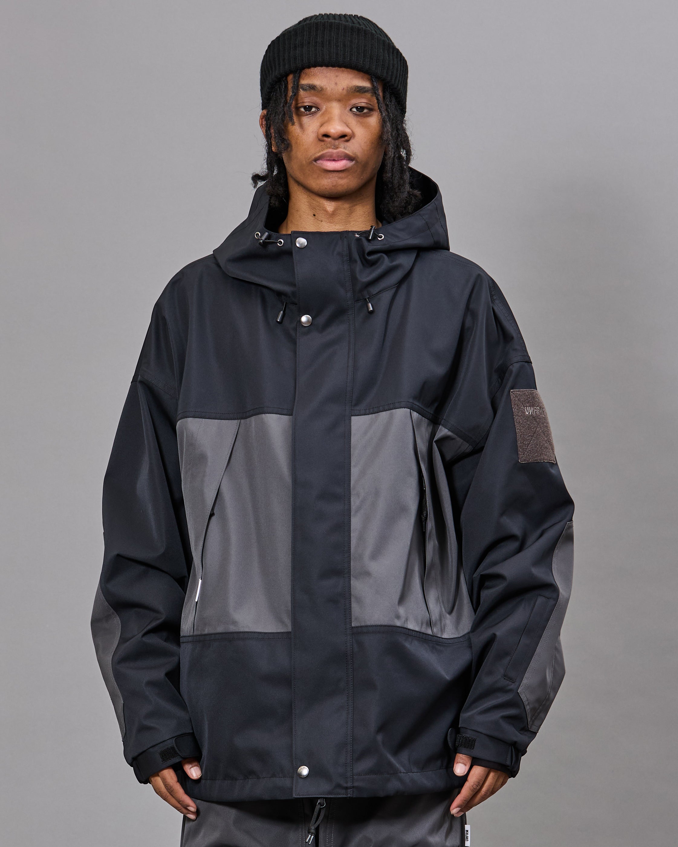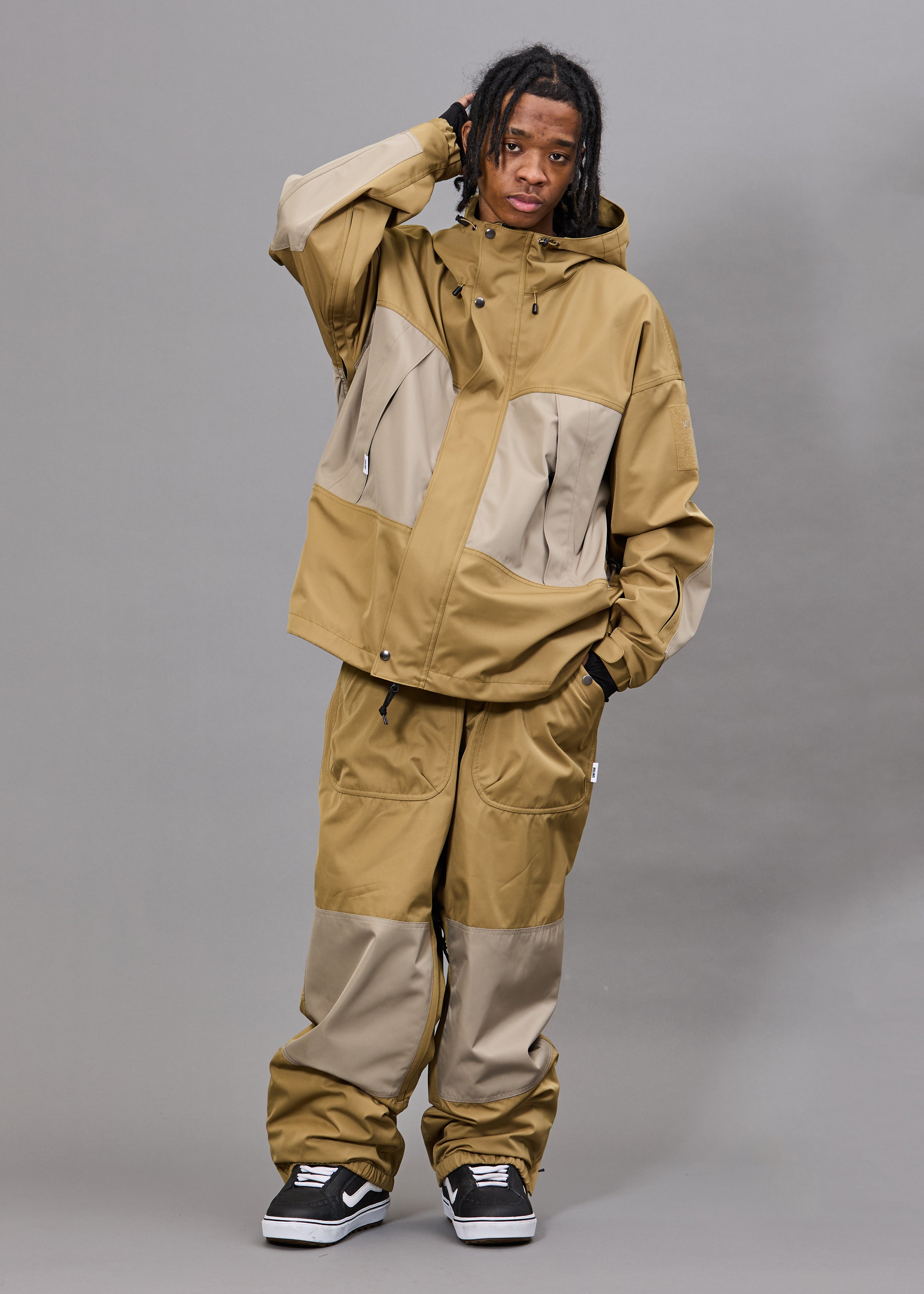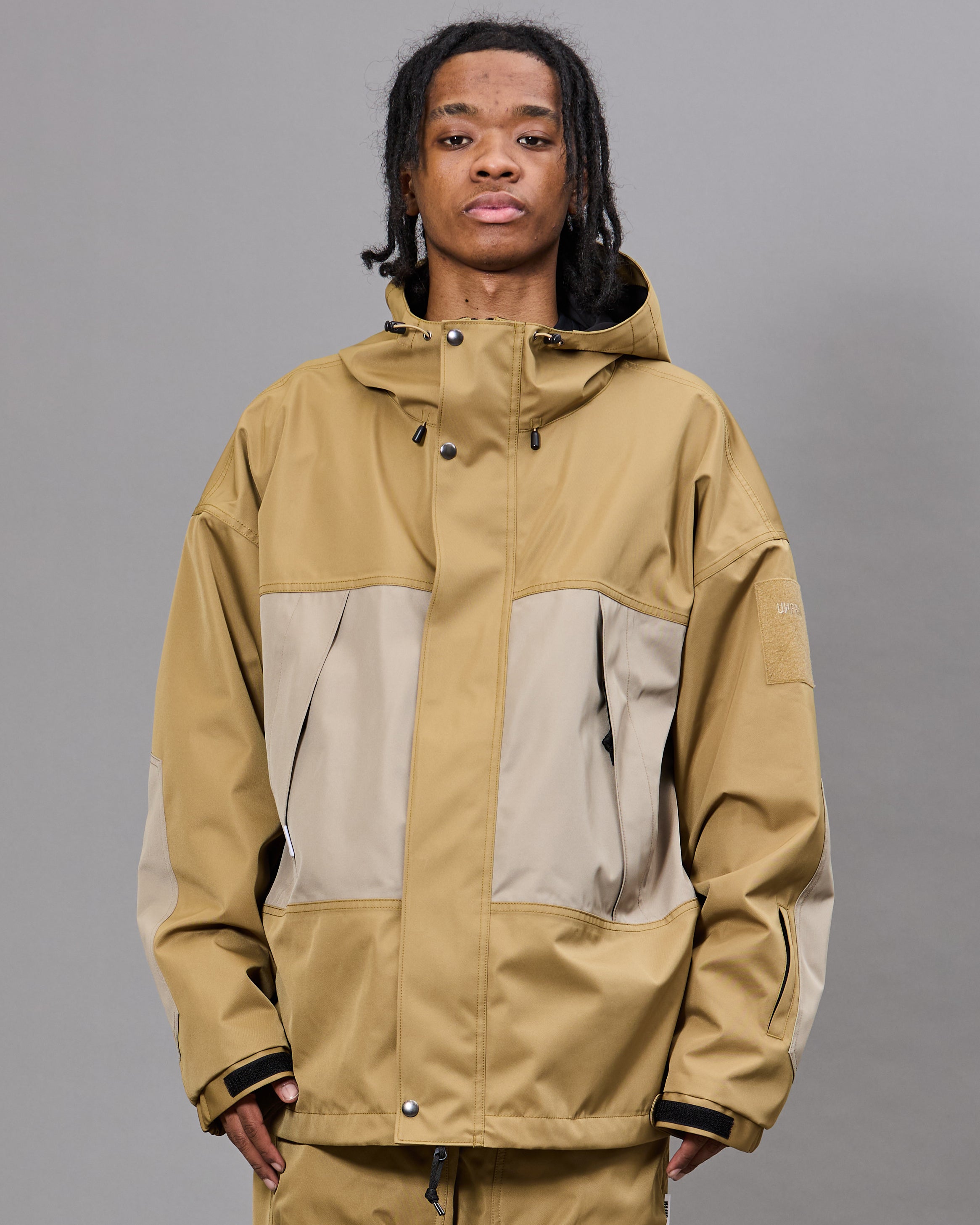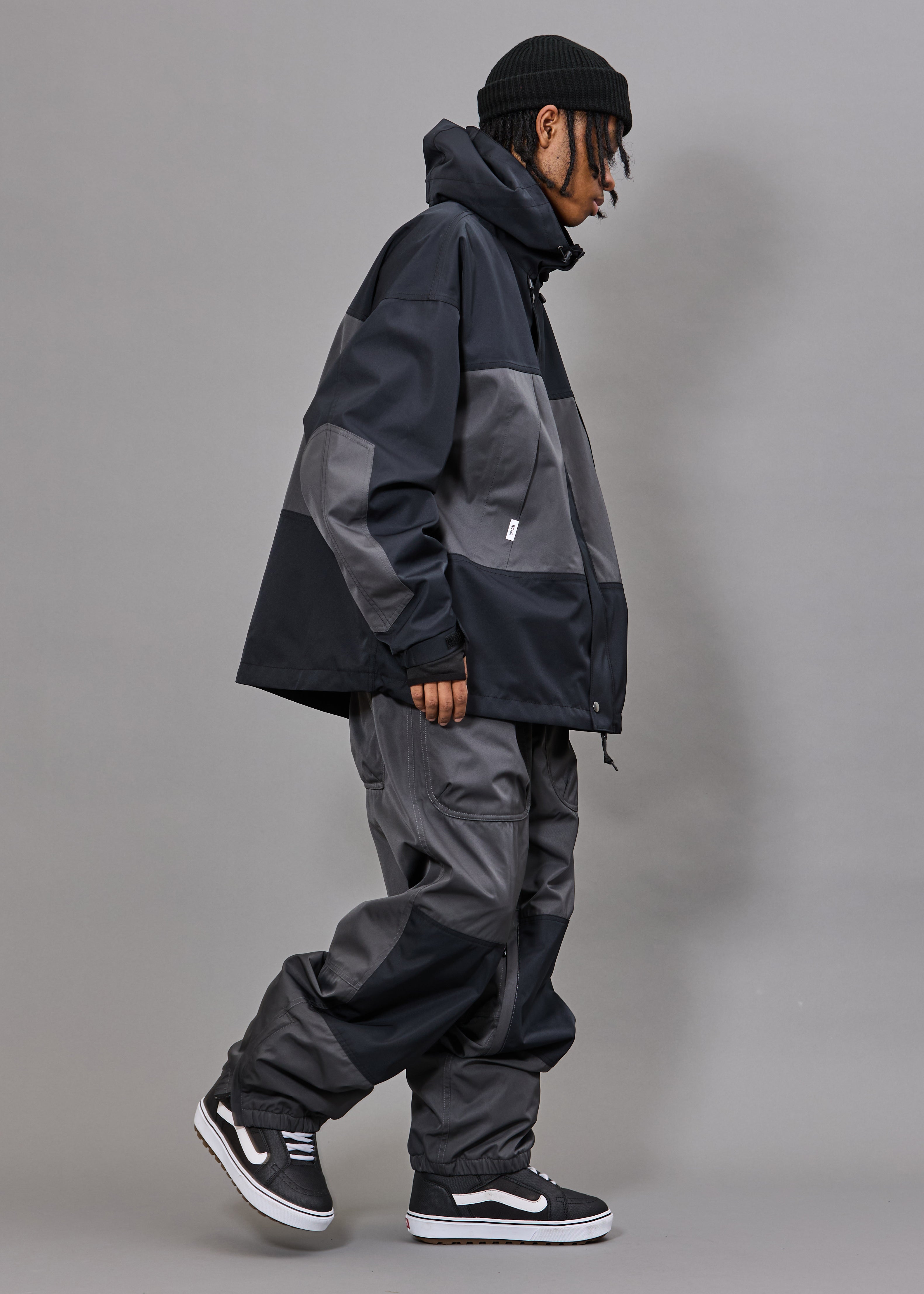 ミリタリーパーカーを着想源に、UNFRMらしいデザインと機能性を融合させた新作ジャケット。ミリタリー感だけでなく、雪山を連想させるディテールとワイドシルエットが特長です。UNFRMの中でも丈が長く、あらゆる環境下でも快適に着用できる設計 で、都市からフィールドまで幅広く対応。フロントの大きなジップポケットを含む5つのポケットと、2箇所のベンチレーションを装備し、機能性と利便性を両立しました。裾には2箇所のドローコードを配置し、シルエット調整が可能。パンツと連結できるパウダーガードに加え、リストゲーター・ウエストゲーターは脱着式で、雪山から街まで対応する2WAY仕様となっています。表面には撥水加工を施し、生地本体は 耐水圧10,000mm/透湿性20,000g/m²/24h を実現。高い機能性と洗練されたデザインを兼ね備えた、UNFRMを象徴するハイスペックジャケットです。