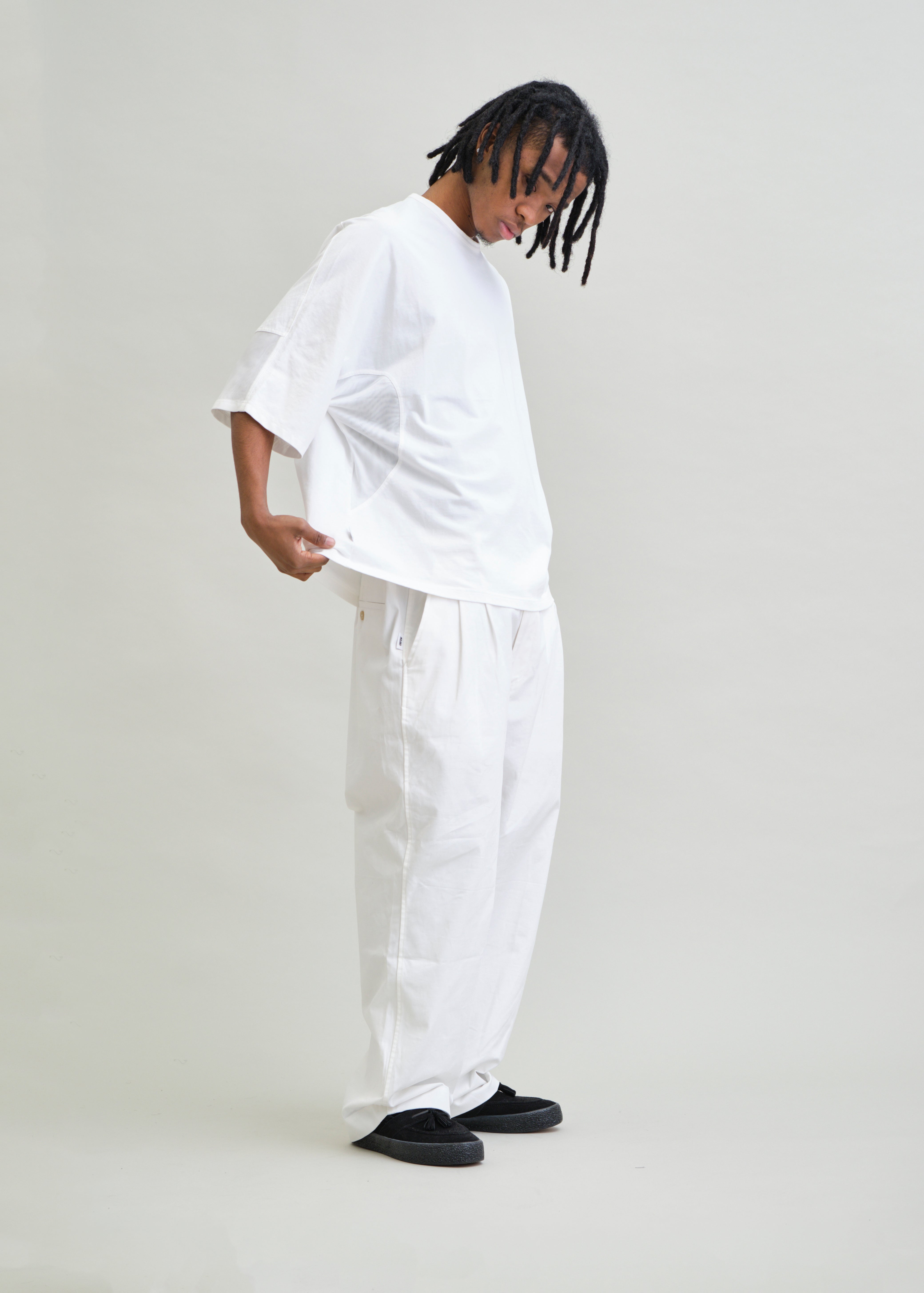 フロントに2タックを入れ、腰まわりに程よいゆとりを持たせたワイドシルエット。