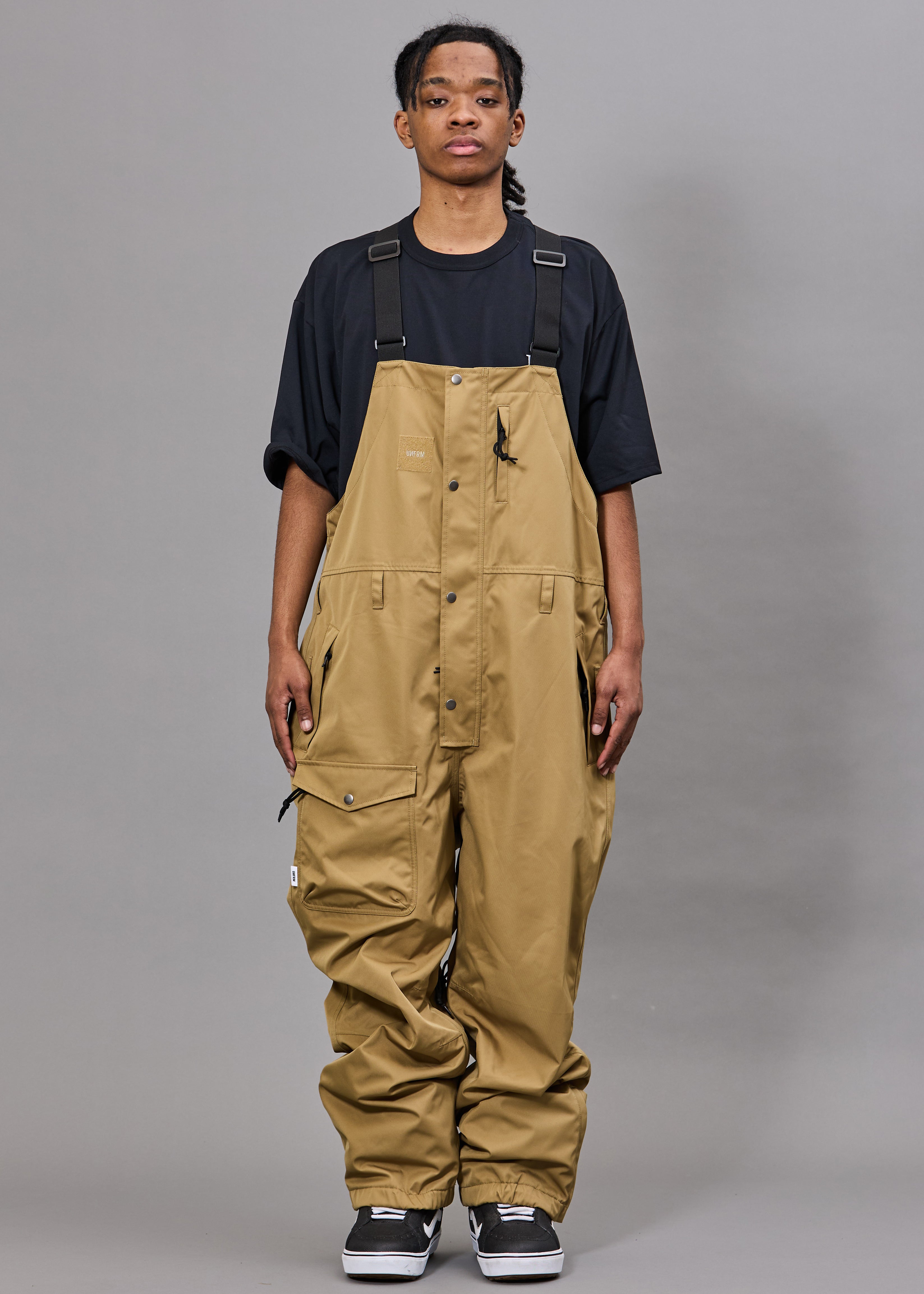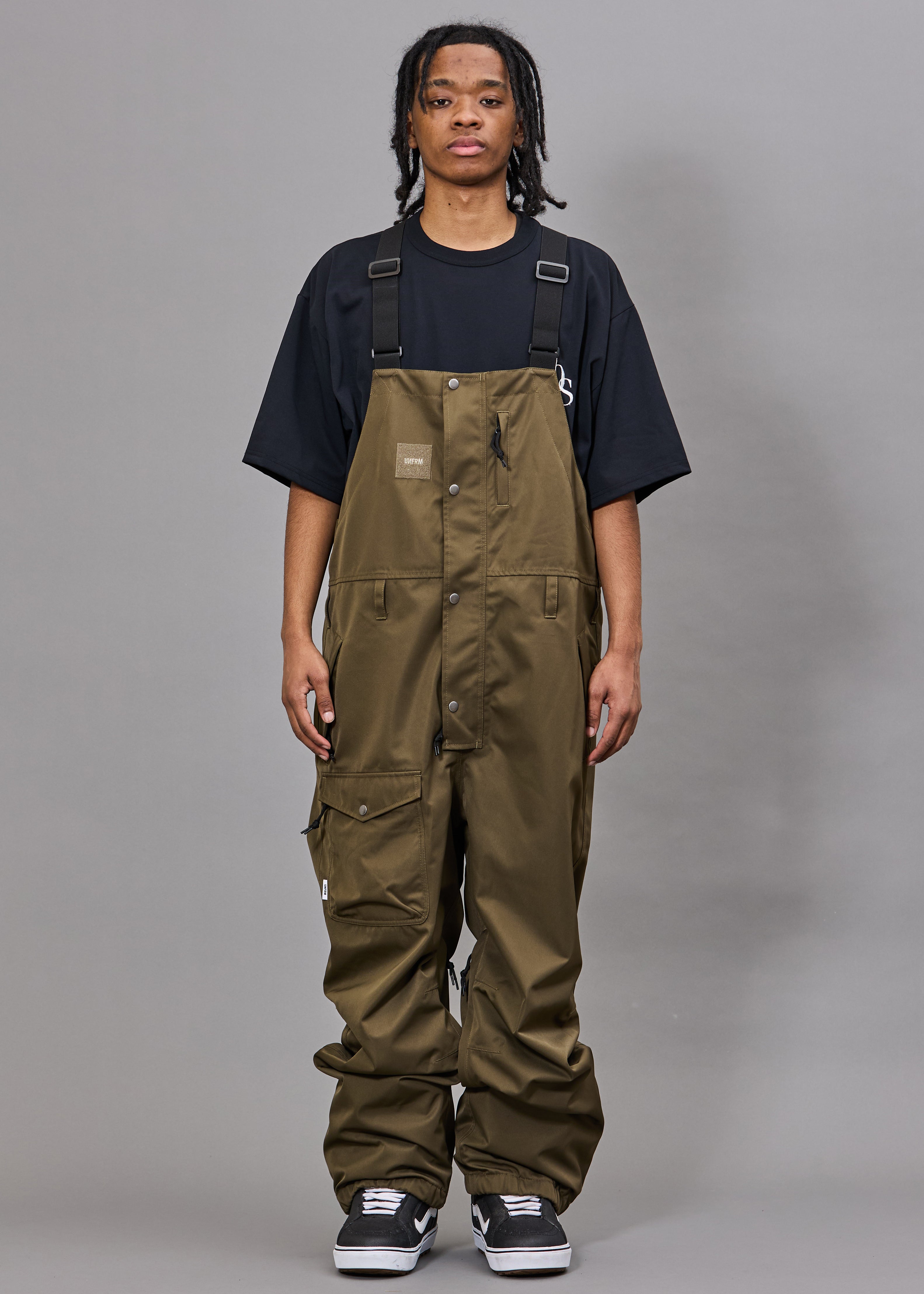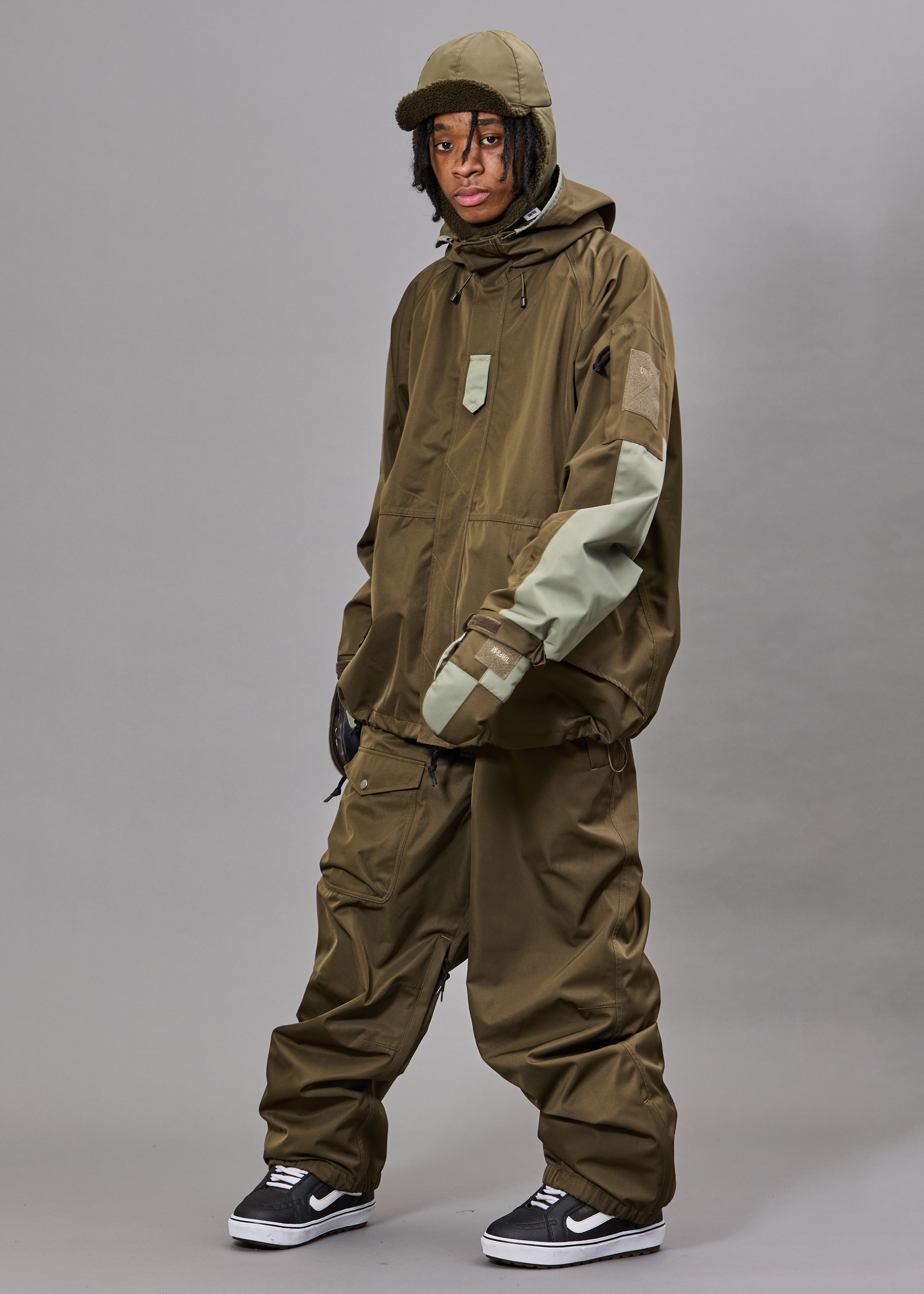 ミリタリーウェアを着想源に、UNFRMらしい機能性とデザインを融合させた MILITARY BIB PANTS。裏地には肌触りの良いマイクロフリースを採用し、保温性と快適な着用感を両立しました。程よいワイドシルエットで動きやすく、2箇所のベンチレーションが衣服内の温度を調整。フロントは長めのYKKビスロンダブルジッパーを使用し、着脱性と利便性を高めています。6つのポケットを備え、収納力も十分。裾にはジッパーとドローコードを配し、ブーツに合わせたシルエット調整が可能です。内側にはパウダーガードを搭載し、雪の侵入を防止。表面には撥水加工を施し、生地本体は 耐水圧10,000mm/透湿性20,000g/m²/24h を実現しています。高い機能性と無駄のないデザインを兼ね備えた、UNFRM SNOWラインを象徴するハイスペックなビブパンツです。