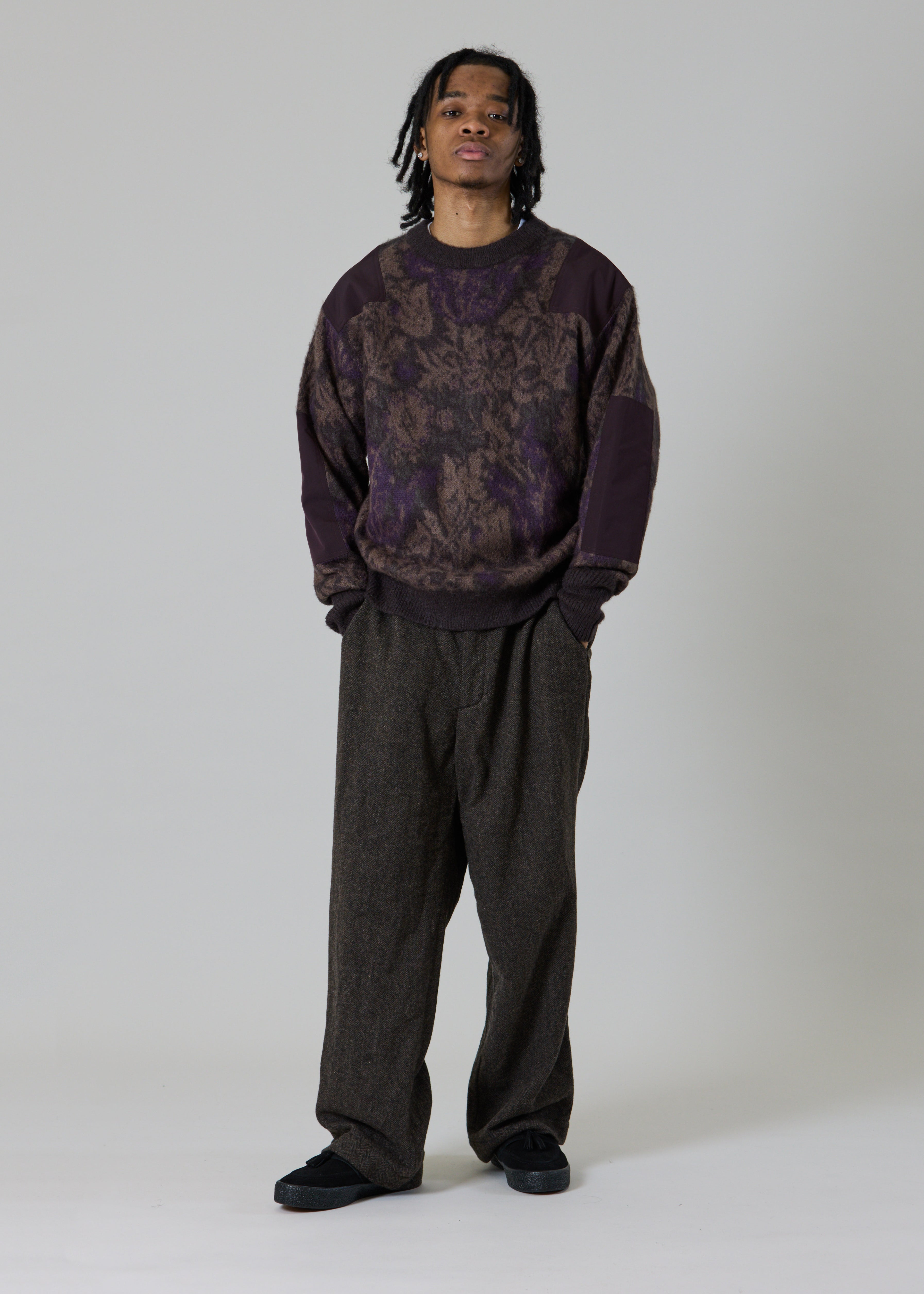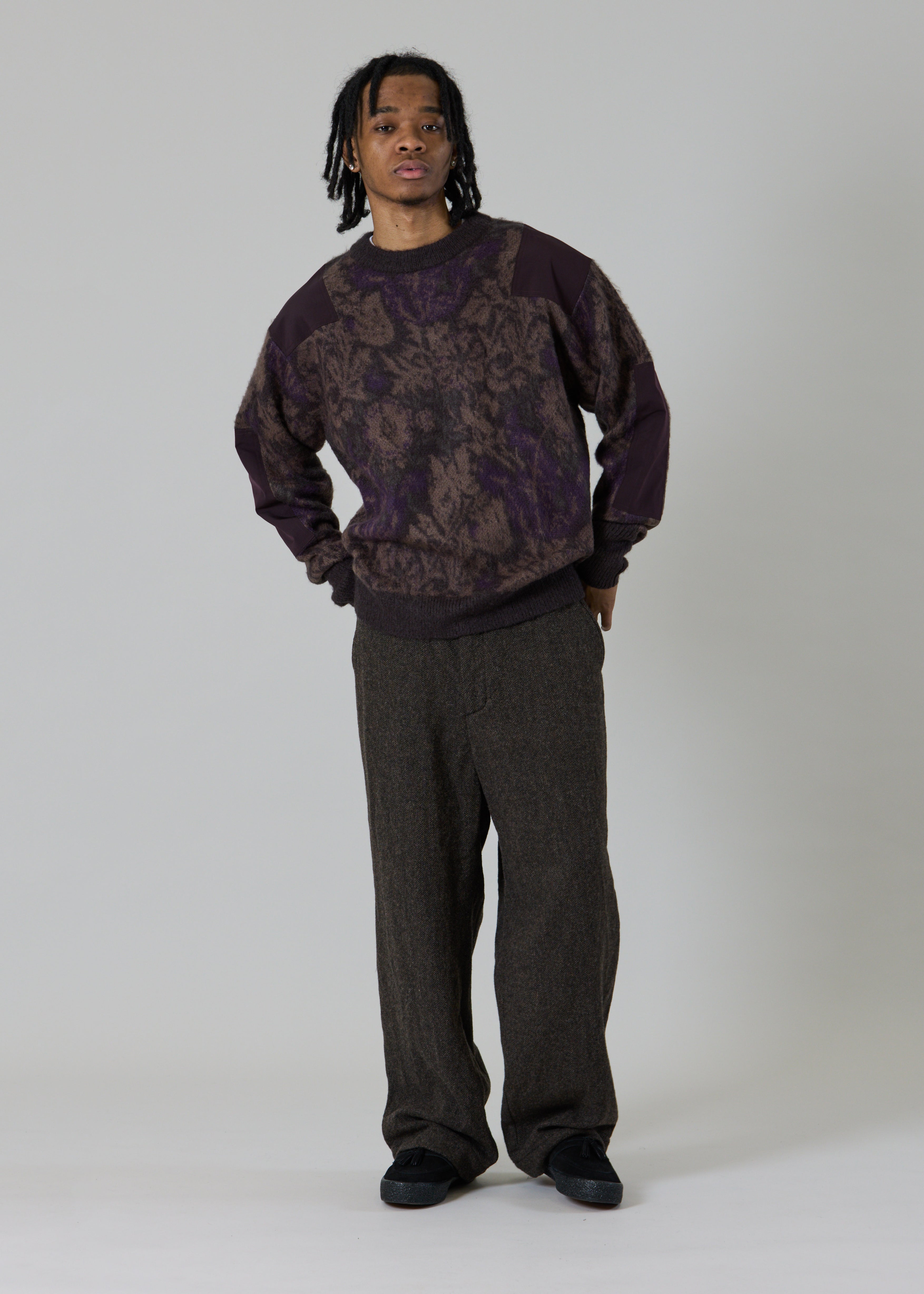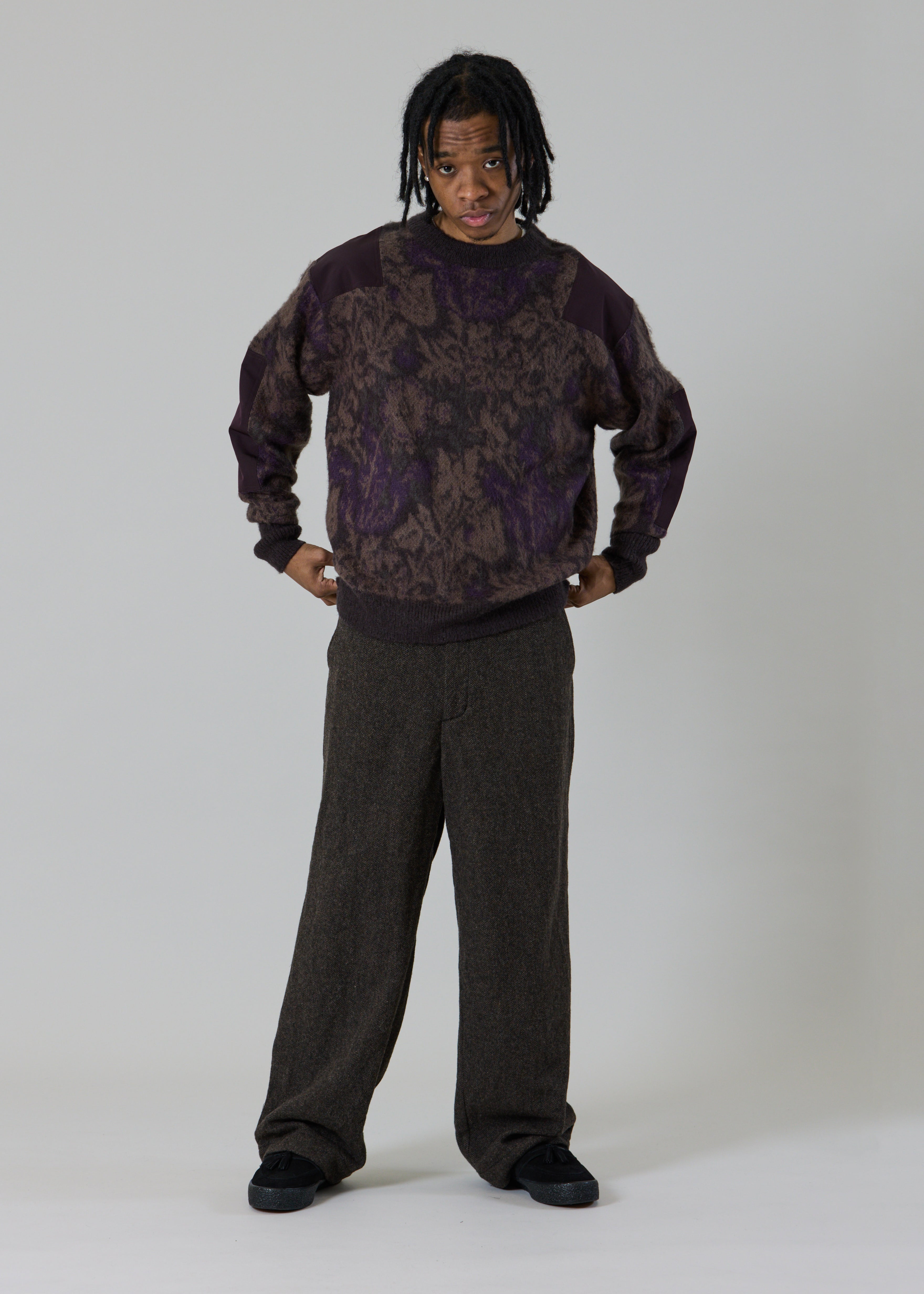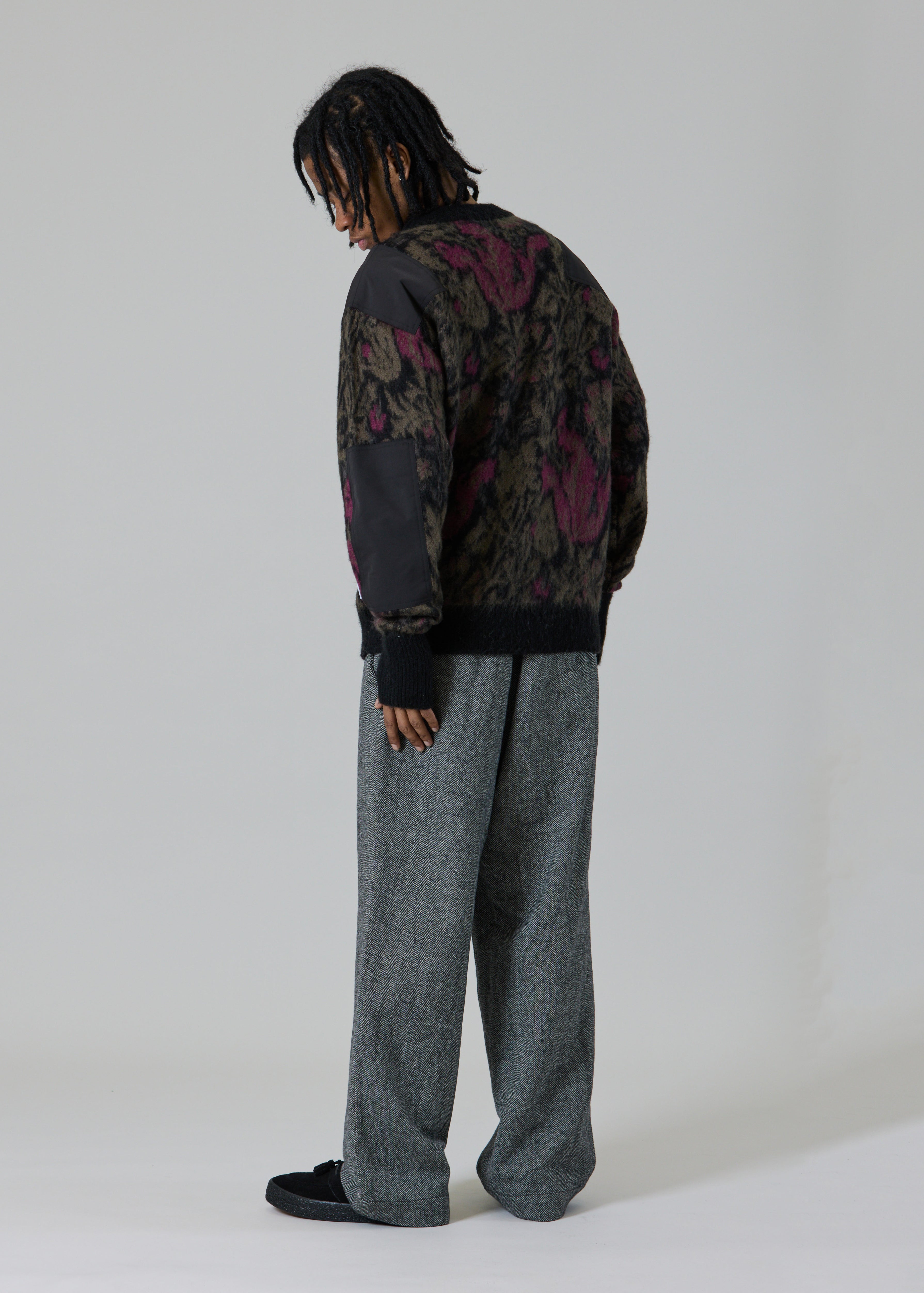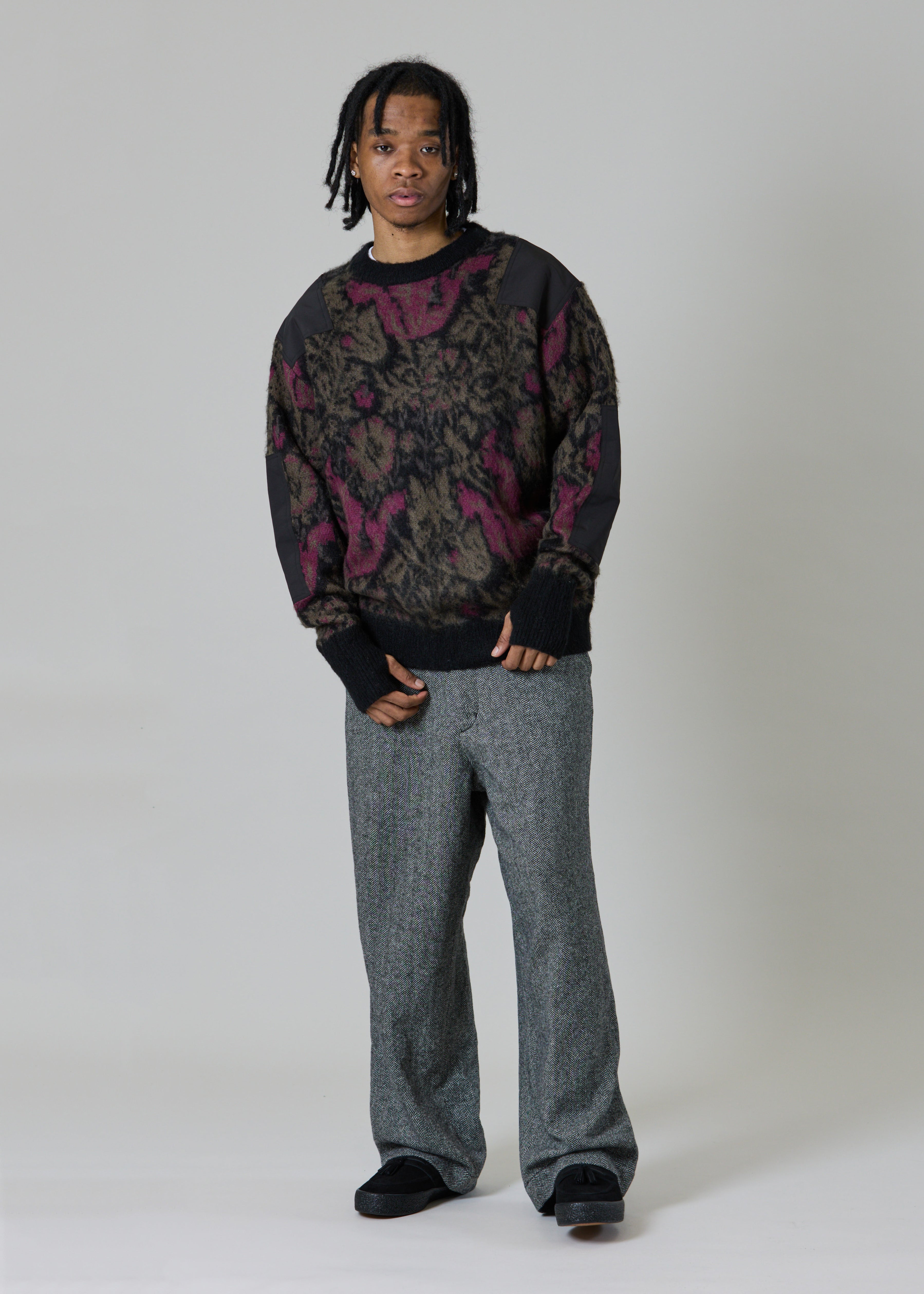 軍モノの定番“コマンドセーター”をベースに、オリジナルのヴィンテージフラワーカモを落とし込んだモヘア混ニット。モヘアならではの軽さと保温性、上品な毛足が生む表情豊かな質感が特長です。肩と肘には別地を配したコマンド仕様で、ミリタリーの機能美を強調。ドロップショルダーと身幅にゆとりを持たせたリラックスシルエットが、クラシックにモダンな抜け感を与えます。無骨さと上品さ、そしてUNFRMらしい柄表現が融合した、存在感のあるキーアイテムです。